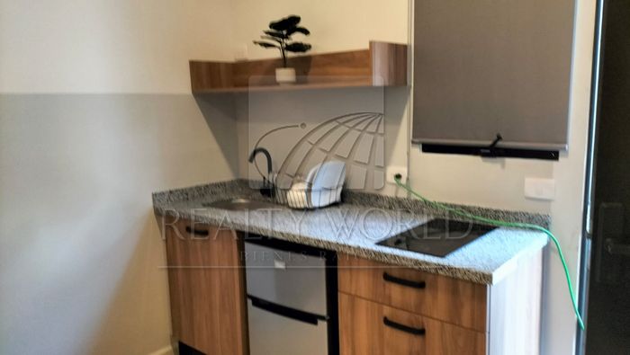 Distribución. Baño completo, cocineta equipada (frigobar, microondas y parrilla de inducción), closet, aire acondicionado, cama matrimonial, pantalla.