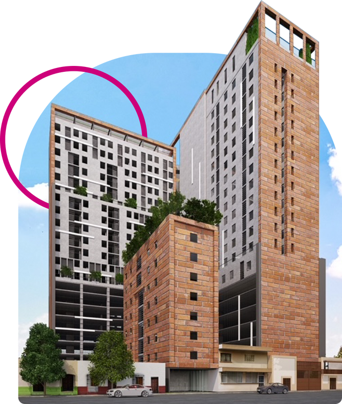 Torre con amenidades como cine al aire libre, alberca, asadores, área de coworking, recepción, área de estudios, gym, área de camastros, entre otras