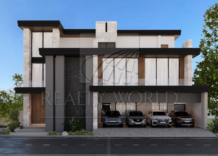 Cochera para 4 autos, acceso principal y doble altura en sala y bar, comedor, cocina integral con family room, despensa, baño completo de visitas, sala de cine/estudio/oficina, opción a cuarta recámara, terraza techada con barra cubierta de granito con tarja y preparación de asador, jardín exterior con baño completo, pasillo de servicio, lavandería, cuarto de servicio con baño completo, cuarto de máquinas, nicho de boilers y alberca. Preparación de elevador.