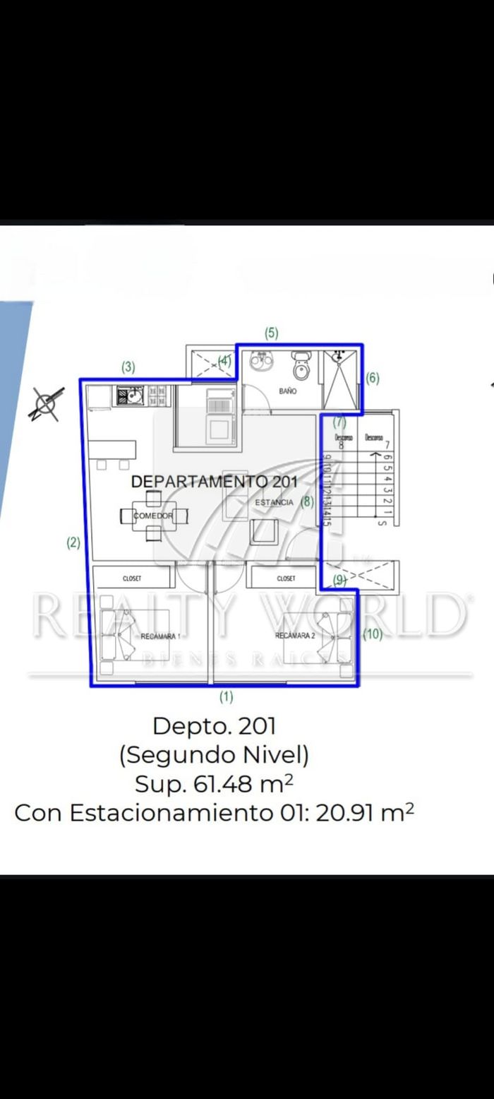 1 lugar de estacionamiento techado con salida independiente y directa. Excelente iluminación y ventilación natural ya que el edificio se encuentra en esquina frente a cancha deportiva, el departamento se entrega con: