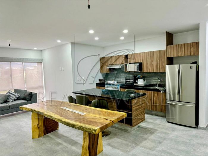 Amplia cocina integral de melamina abierta y cubierta de granito en Isla, estancia sala – comedor, ½ baño para servicio de área social, estudio.