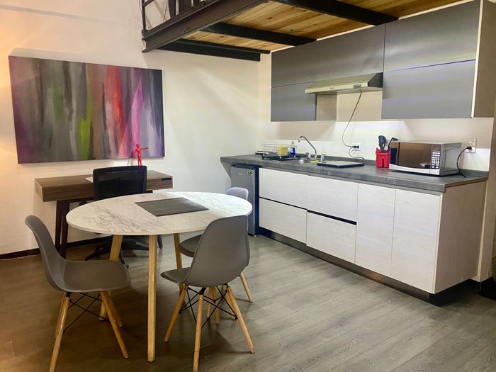 Equipamiento: Cocina con parrilla, campana, frigo bar, microondas, cafetera. Antecomedor para cuatro personas, sofá, minisplit frío/ calor, tv, cama queen, escritorio de trabajo, baño completo.