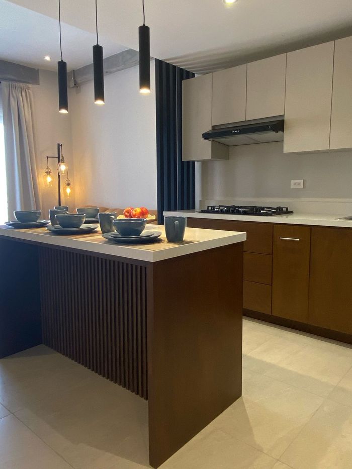 Cocina integral con parrilla, isla central como barra desayunadora, refrigerador