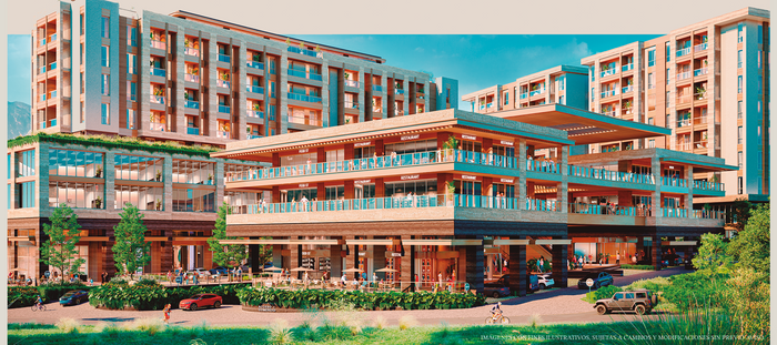 Conjunto Urbano de usos mixtos , compuesto por 2 Torres y área comercial , 300 departamentos , 34 oficinas y 35 locales comerciales con restaurantes y tiendas AAA .